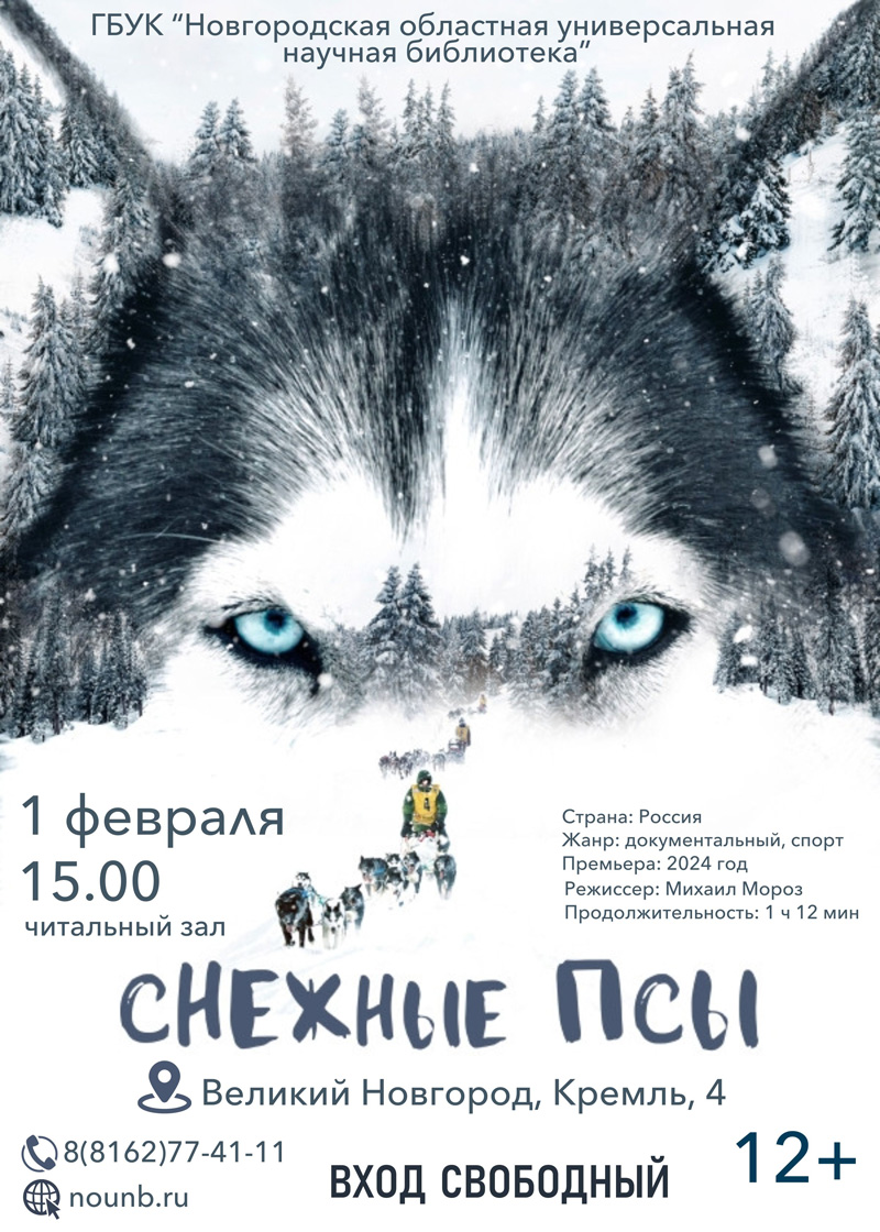 1 февраля в 15.00 в читальном зале Новгородской областной универсальной научной библиотеки (Кремль, 4) состоится открытый показ документального фильма «Снежные псы». Мероприятие пройдет в рамках Международного фестиваля спортивного кино, организованного федеральным партийным проектом «Детский спорт».