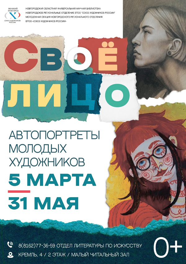 5 марта в 17.00 в малом читальном зале Новгородской областной универсальной научной библиотеки (Кремль, 4) открывается выставка автопортретов «Своё лицо». Организатор выставки — Новгородское региональное отделение «Союз художников России».