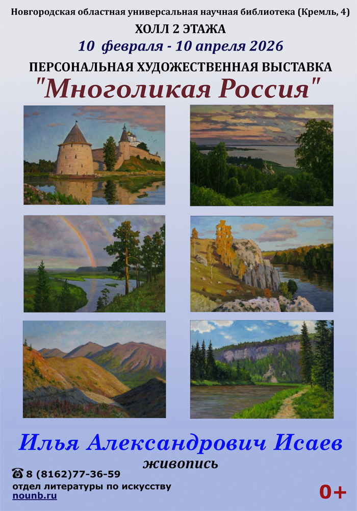 В холле 2 этажа Новгородской областной универсальной научной библиотеки работает выставка работ Ильи Исаева «Многоликая Россия».