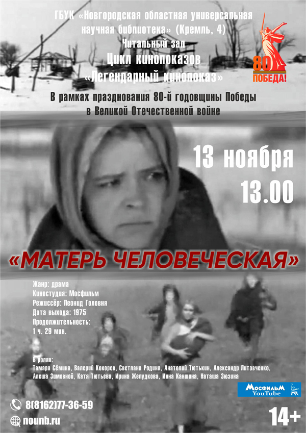 13 ноября в 13.00 в читальном зале Новгородской областной универсальной научной библиотеки (Кремль, 4) состоится показ тринадцатого фильма из цикла кинопоказов, приуроченных к 80-летию Победы в Великой Отечественной войне.
