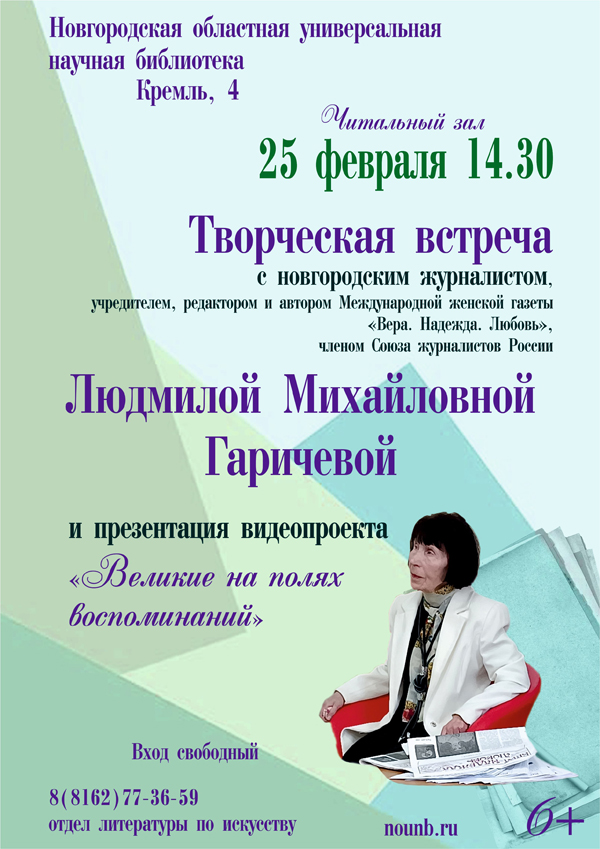 В Новгородской областной универсальной научной библиотеке состоится творческая встреча с новгородским журналистом, автором книг, учредителем, редактором и автором Международной женской газеты "Вера. Надежда. Любовь", членом Союза журналистов России Людмилой Михайловной Гаричевой.