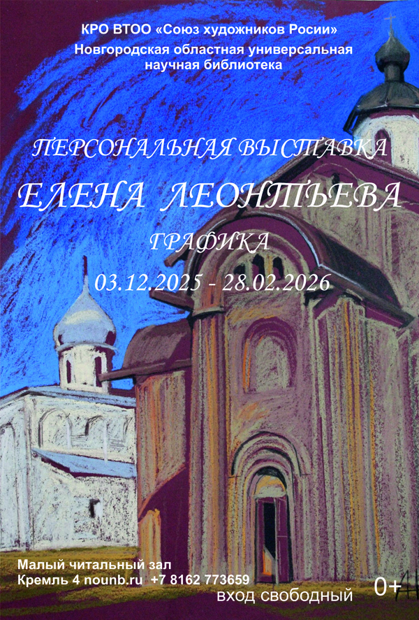 В малом читальном зале Новгородской областной универсальной научной библиотеки работает персональная выставка графики Елены Леонтьевой (Республика Карелия).
