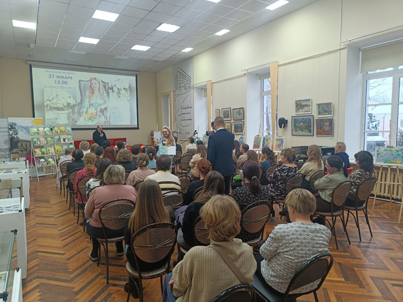 Слушатели были полностью поглощены выступлением, с увлечением разглядывали иллюстрации и не упустили возможности задать вопросы о том, как именно писатель и художник работают в тандеме. В финале встречи Елена Велена сделала щедрый подарок: передала библиотеке и её читателям свои книги с личными автографами.
