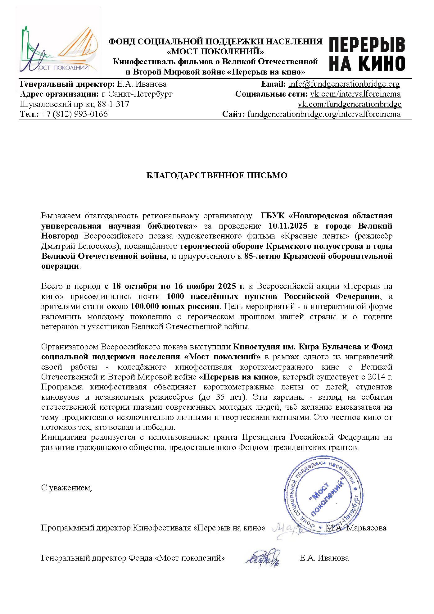 Новгородская областная библиотека присоединилась к Всероссийскому кинофестивалю фильмов о Великой Отечественной и Второй Мировой войне «Перерыв на кино».