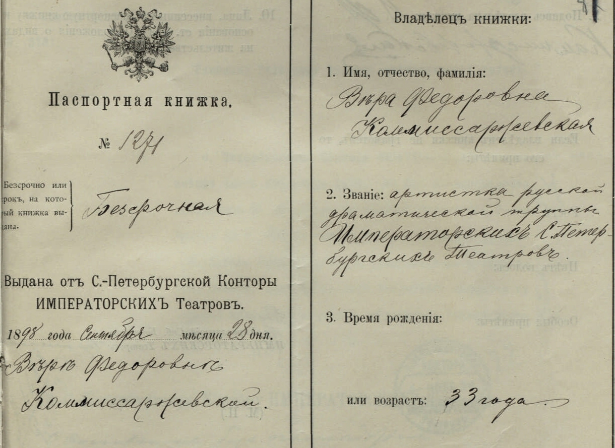 В фонде Президентской библиотеки можно ознакомиться с уникальным документом «Дело о службе актрисы русской драматической труппы Веры Комиссаржевской» (1896) Это задокументированная история служения Веры Фёдоровны в Александринском театре – начиная с подписанного ею контракта о приёме в труппу, паспортной книжки, ведомостей о стоимости билетов на её бенефисы и заканчивая заявлением об уходе из труппы, которое актриса написала в июле 1902 года.